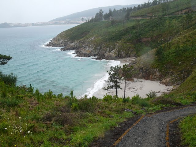 Espero pasar un poco la lluvia y sigo por carretera. Cuando el camino mejora pues es un sendero, empieza a llover fuertemente. Y había pasado sólo 1 km ... Y así llegué a Finisterre entres hermosas playas y muy mojado.